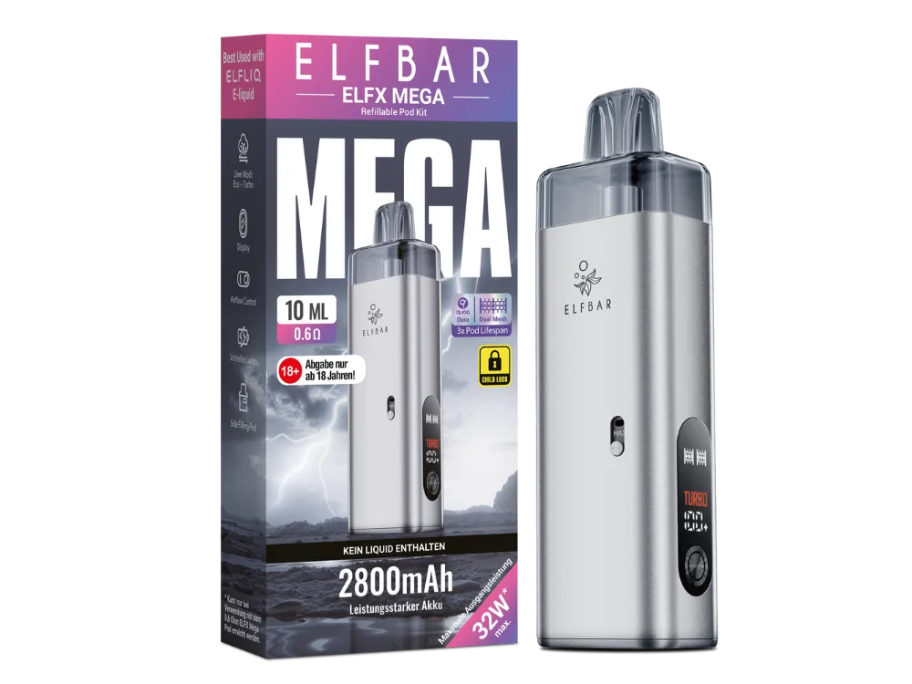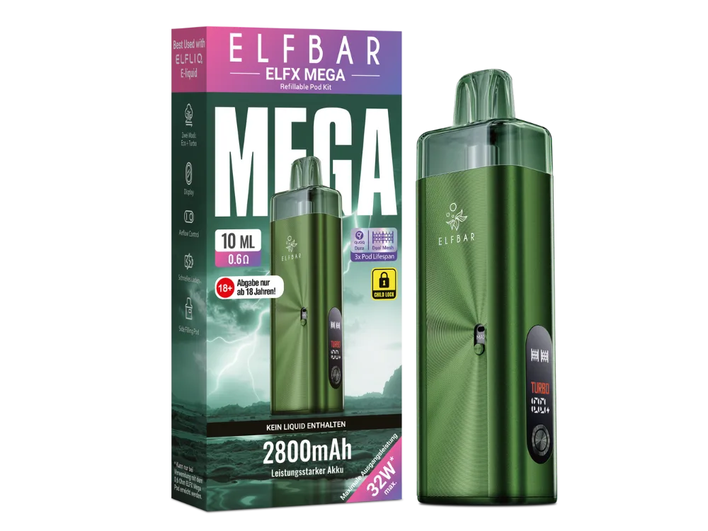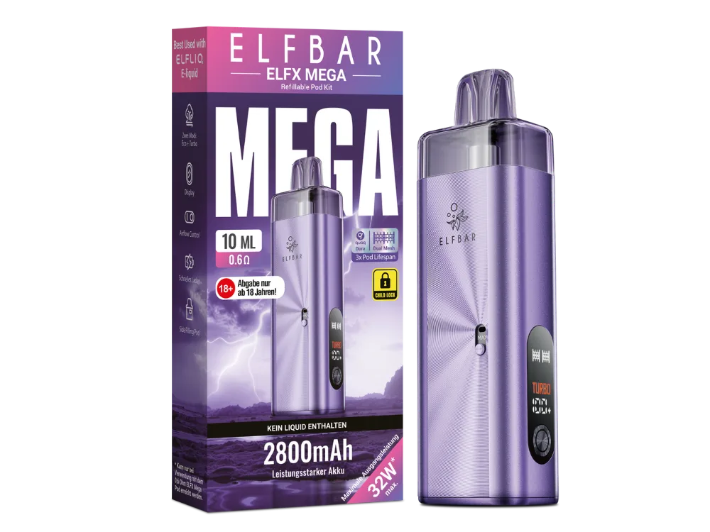 Das Elfbar Elfx Mega E-Zigaretten Set ist ein Pod-System bestehend aus dem Elfx Mega Akku und wechselbaren Elfx Mega Pods. Das Gerät wird in verschiedenen Farben angeboten. Es ist für das Dampfen im Bereich MTL (Mund-zu-Lunge) und RDL (restriktives direktes Lungen-Dampfen) konzipiert. Der Akku weist eine Kapazität von 2.800 mAh auf. Die Leistungsabgabe ist über die Bedienelemente regulierbar.